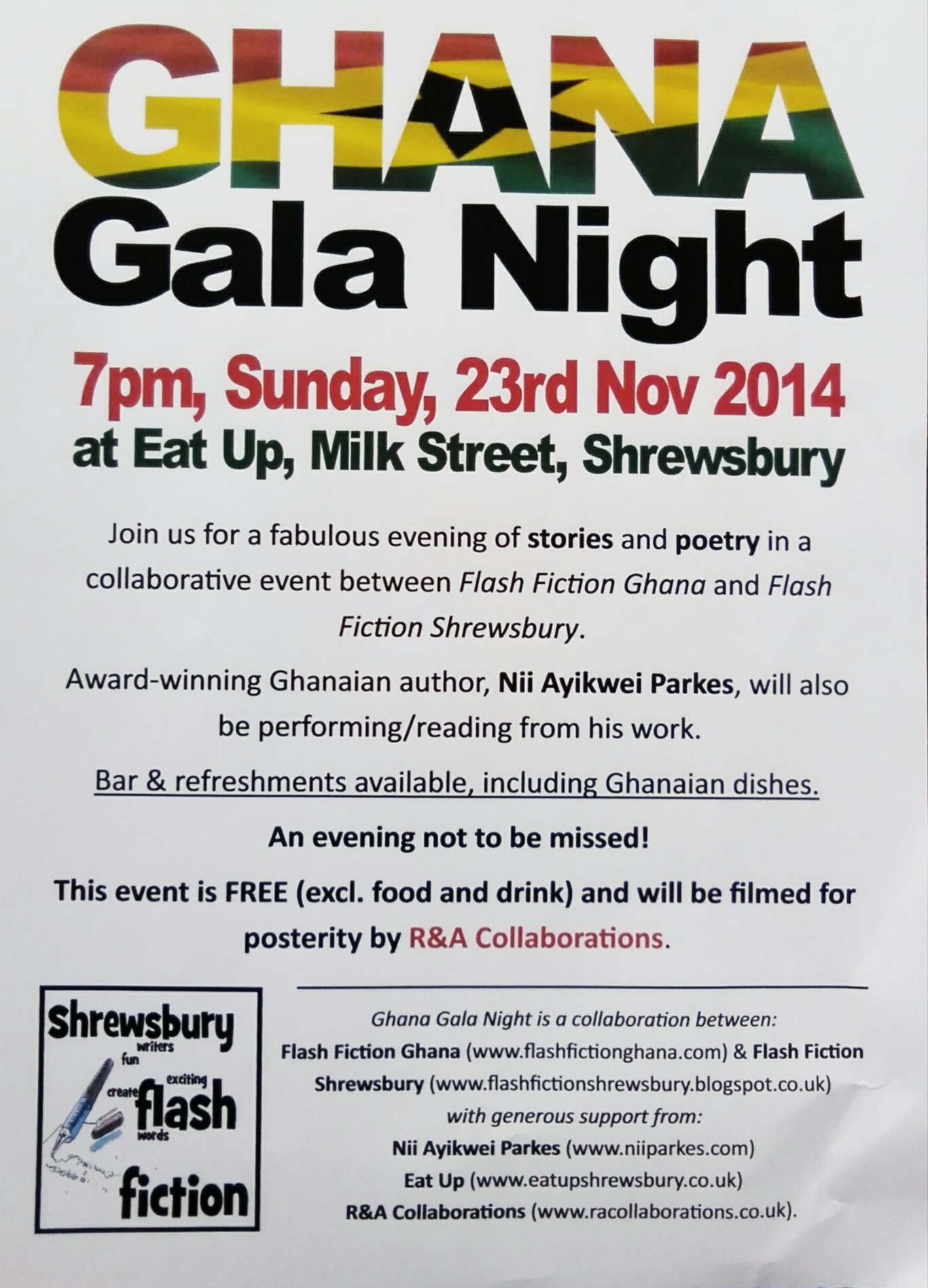 Flash Fiction Shrewsbury and Flash Fiction Ghana are happy to announce a literary collaboration set to roll out in the next few days. Keep following the ‘Flash Fiction Ghana’ page on Facebook and @flashfictiongh on Twitter for updates. And if you are anywhere near Shrewsbury, you really should mark your calendar for this great event which will also feature award-winning Ghanaian author Nii Ayi Kwei Parkes.